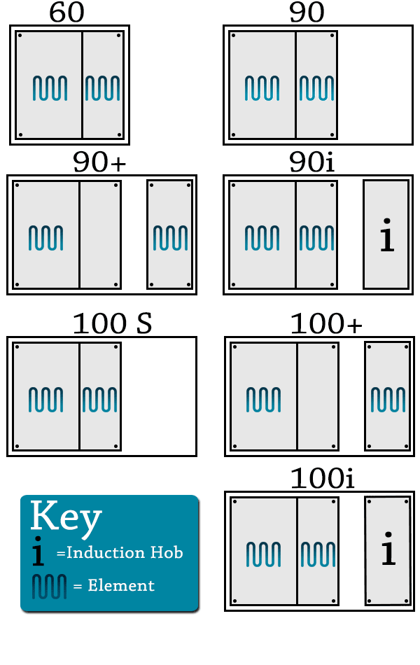 The 60, 90, 90+, 100s, 100+ and 110+ all offer the same heat producing capability from 4 main cooking elements with a fifth in the grill. The + models makes use of the simmer plate heating element and places it in its own separate housing increasing the available cooking space from the same number of elements.